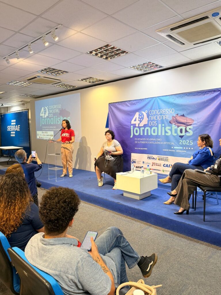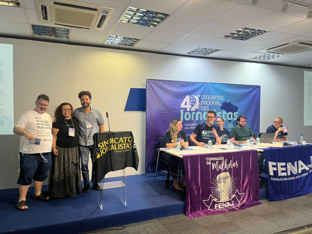 Durante o congresso, os jornalistas alagoanos participaram de plenárias e painéis que abordaram temas como a precarização do trabalho jornalístico, a importância da regulamentação das Big Techs e a necessidade de garantir a transparência no uso das inteligências artificiais. O presidente Alexandre Lino foi mediador do painel “Atuação de Jornalistas contra o fascismo e a extrema direita”.
